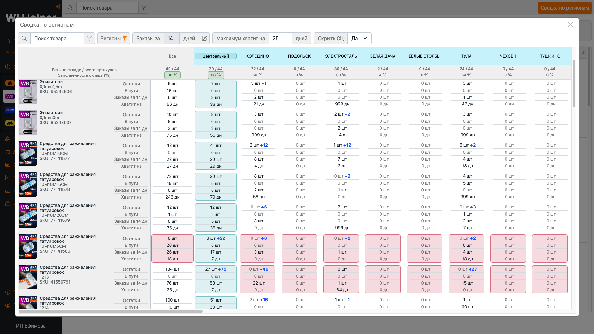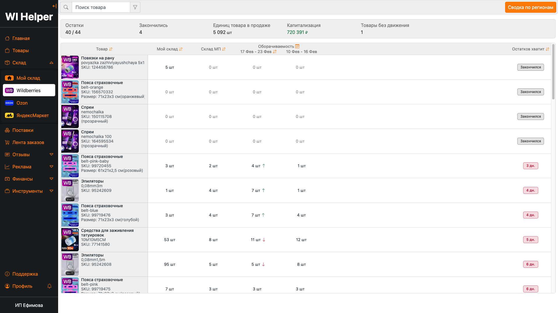 Возможность следить за остатками товаров на складах маркетплейсов и прогнозировать на сколько хватит ваших товаров. Анализ загруженности складов и регионов.