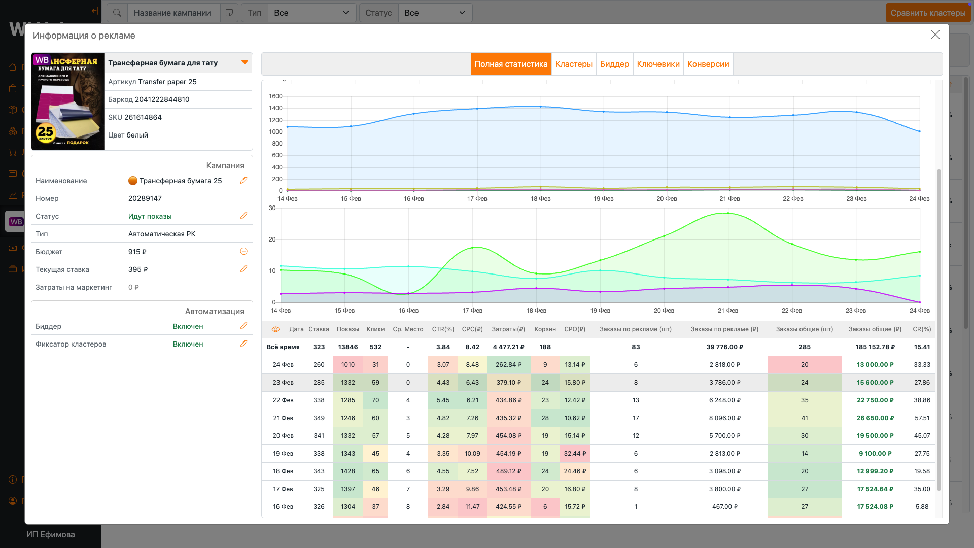Просмотр статистики, управление кластерами и настройка биддера в одном месте. Также вы можете пополнять бюджет, изменять ставку, управлять активностью Ваших РК.