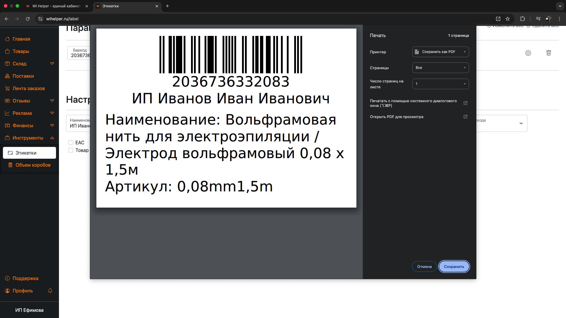 Выберите товары и укажите количество. Данные о баркоде, наименовании и артикуле заполнятся автоматически. Печатайте на термопринтере или обычном принтере формата А4.